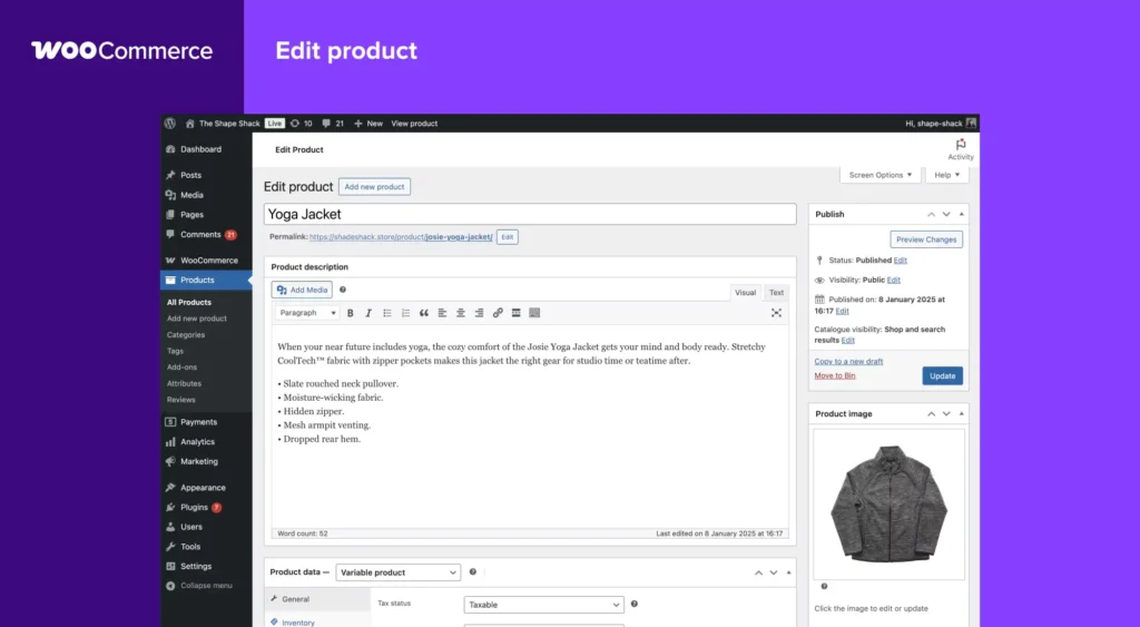 Ürün varyantları (renk, beden, model) için değişken ürün özelliğini kullanın.